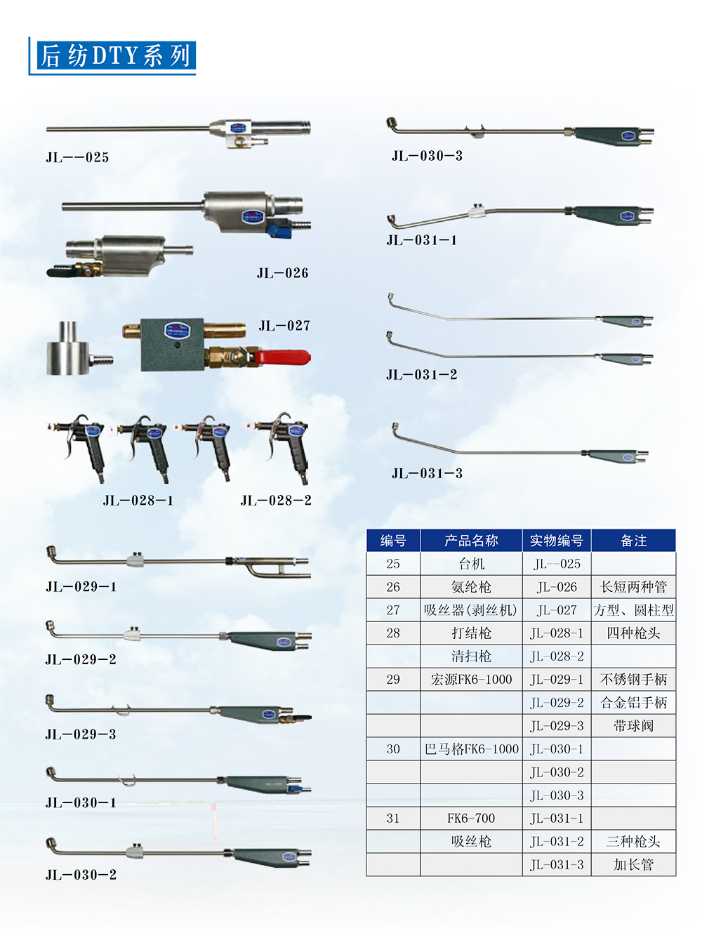 主營各種系列吸絲槍和各種規(guī)格快速插座、升絲拉桿為主。吸絲槍主要包括高速紡FDY、 POY、短絲槍、工業(yè)絲槍,包括紡DTY、加彈機系列。來圖來樣生產(chǎn)。